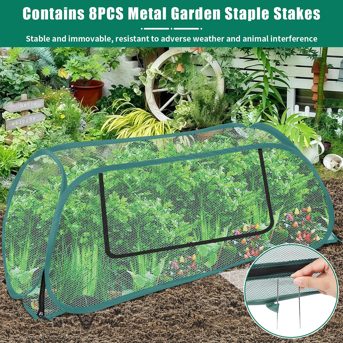 【TOOL-FREE, 60-SECOND SETUP】: Unfold, zip up the two side zippers, stake down the corners with the included staples—done. Crystal-clear panels let you inspect growth without lifting the cover, and the wind-proof anchor system keeps the greenhouse firmly in place on breezy days